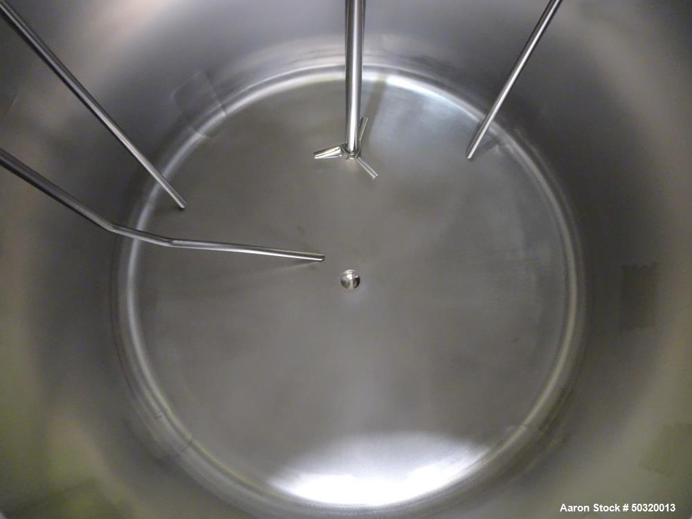 Used Lee Industries Pressure Mix Tank, 250 Liter, Model 250 LDBT, 316L Stainless Steel, Vertical. Approximate 30" diameter x 19" straight side, dished top and bottom. Internal rated 35 psi at -20 to 275 degrees F, vacuum internal. Top entering 3-blade turbine agitator, requires motor/drive. Openings top: 14" with cover, (1) 3", (6) 1-1/2". 1-1/2" Center bottom outlet, approximate 6-1/2" discharge height w/o valve, 2-1/8" with valve. Mount on (4) legs with casters. National board# 5085, Serial# B6058A7, Built 1991.