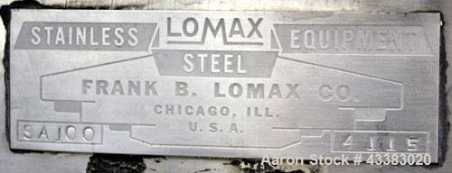 Used Lomax Stainless Steel Equipment Tank, 100 Gallon, Model SA100, 304 Stainless Steel, Vertical. Approximate 30-1/2” diameter x 36” straight side. Open top, no cover, slight coned bottom. 2” Tri-clamp center bottom outlet. Mounted on 3 stainless steel legs, approximate 18” discharge height.
