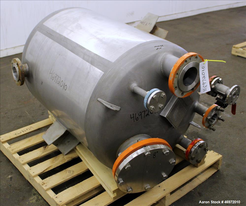Used Precision Stainless Tank, 100 Gallons, 316 Stainless Steel, Vertical. Approximate 32" diameter x 35" straight side, dish top and bottom. Internal rated atmospheric at 350 degrees F. Openings top: (2) 1", (2) 2", 4", 8", (1) 3" side outlet. 2" Center bottom outlet. Side lug mounted. Serial# 7208-6, built 1986.
