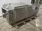 Used Sunset Milk Cooler Tank, Model MC-300PX, Approximate 300 Gallon, Stainless Steel, Horizontal. Approximate 73" long x 36.5" wide x 34" deep. (2) Top hinged covers. Middle bridge with provision for agitator. Bottom end outlet. Mounted on (4) legs. 18MC672.