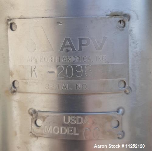 Used Tank, 1,500 Gallon, 316 Sanitary Stainless holding vessel manufactured by APV. Vessel is 6' diameter by 6'6" straight side internal, insulated and complete with cone bottom to 3" center bottom outlet, dished top with assorted top inlets and 18" diameter manway. Tank has stainless exterior and legs for wash down and sanitary use. Previously used in at a yogurt processing facility. Tank has level sensor.