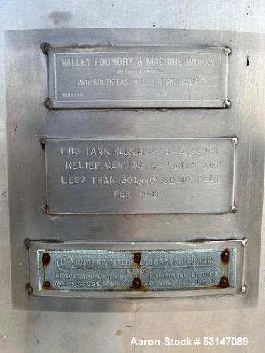 Fabricated by Valley Foundry & Machine Works, the vessel is UL rated, making it suitable for flammable or hazardous liquid storage applications. It was previously used for solvent storage and is ideal for repurposing in chemical, manufacturing, or bulk liquid operations.