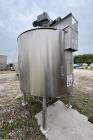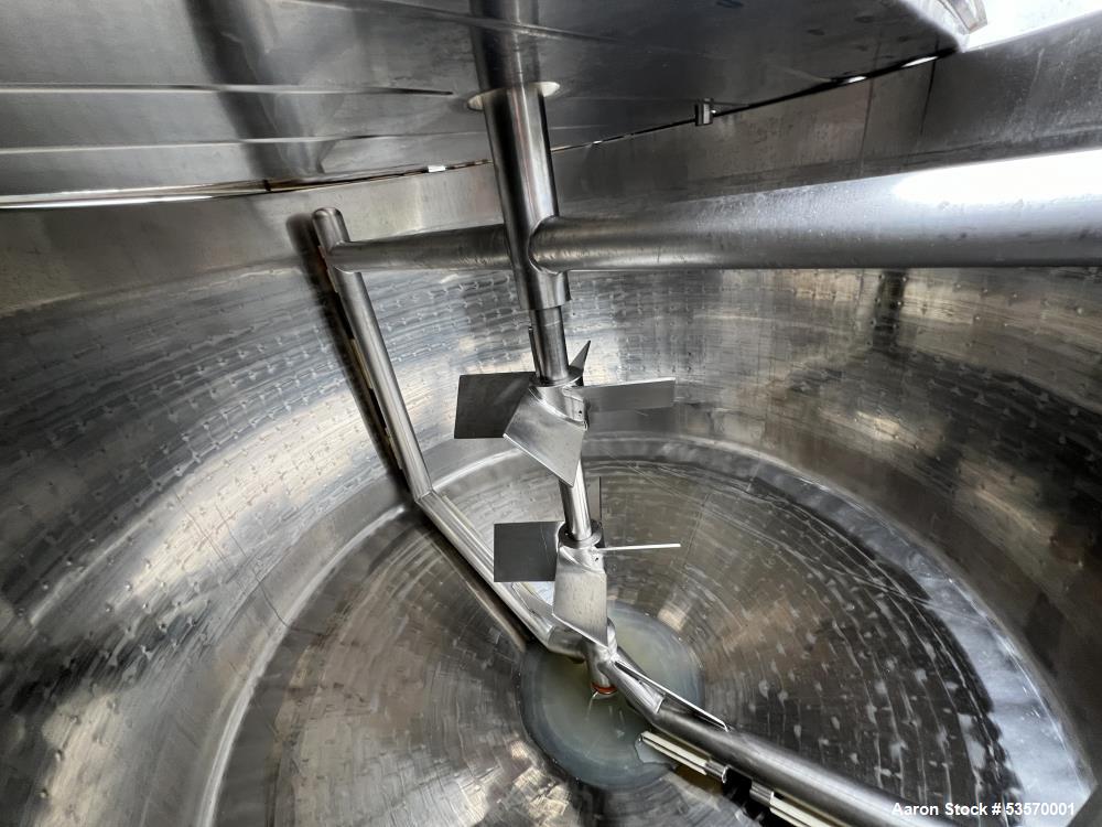 Used Viatec 1049 Gallon Jacketed Mix Tank, 304 Stainless Steel, Vertical. Approximate 76-1/4" diameter x 46" straight side. Flat top, conical bottom. 304 Stainless steel dimple jacket rated 50 psi at -20 to 300 degrees F. Agitator bridge with top entering anchor style agitator, sidewall and bottom scrapers, inner bar style. Anchor Driven by a 5hp, 3/60/230/460 volt, 1755 rpm gear motor, 120.03:1 ratio. Inner Bar agitator driven by a 3hp, 3/60/230/460 volt, 1770rpm gear motor, 20.32:1 ratio. 2" Center bottom outlet with valve, 17" discharge height. Mounted on (4) legs. National Board# 8313, Serial# 107205-2.