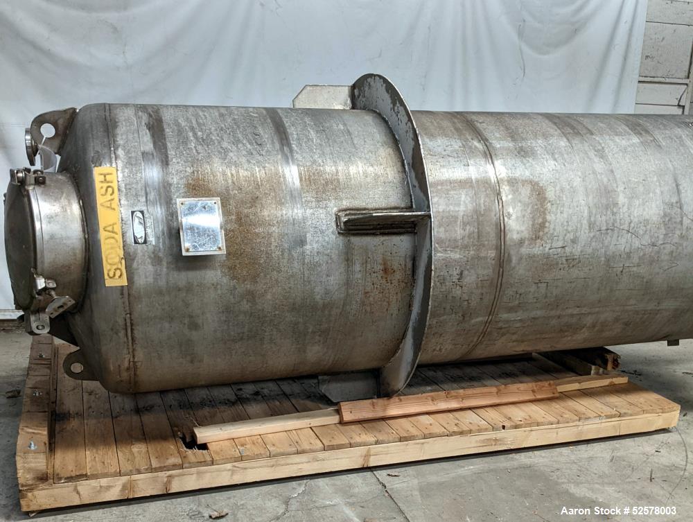 Used Mason Mfg Co Stainless Steel Tank, Approximate 700 Gallon, 304 Stainless Steel, Vertical. Approximate 48" diameter x 126" straight side. Dished heads. Internal rated 5 psi at 100 degrees F. Openings: 20" manway with cover, 6" diameter with 11" flange, (2) 2" diameter with 6" flanges. 3" Center bottom outlet with valve. (4) 3" Diameter leg sockets, no legs. Platform support ring, 5' from top, 7' from bottom. Serial# 94-2115.