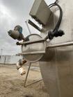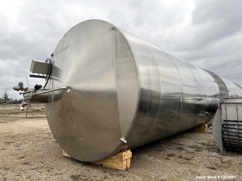 Used CSC Les Constructions Soudees Du Coteau, Holding Tank. 26,980 Gallon capacity, 316 Stainless Steel, Vertical. Cone Top, Slope Bottom. Approximate 13'2" diameter x 316" straight side. 58" long Single Top Band of Dimple Jacket 99" from top. Openings Top: 19-1/2" diameter manway with cover, with (4) 2" on flange, Side: 3/4" threaded, (4) 1" threaded, (3) 2-1/2", 3", 16" x 21" manway with door. Shell is approximately 1/8" thick. Serial# E7989. Shipping Dimensions are 375" long x 168" Wide x 168" Tall, 12,000 lbs. Dent on top cone.