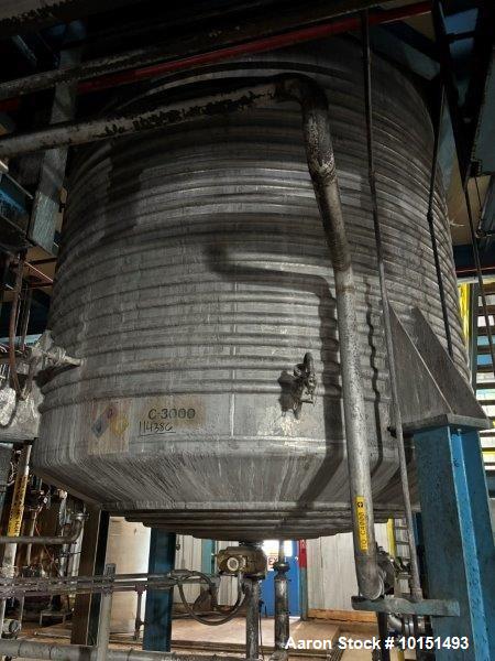 Used Alloy Fabricatorss Approximately 8,000 Gallon 316L Stainless Steel Jacketed Mix Tank. 126" diameter x 128" straight side; Dished top and bottom; Internal rated 15 psi at 210 degrees F; 304 stainless steel half-pipe jacket rated 85 psi at 210 degrees F; 7.5 hp axial type agitator, 316 stainless steel, dual hub with 3 blades each, 56" dia.; 18" dia. 2 blade radial flow at bottom. Serial # 1-132A; Built 1991.