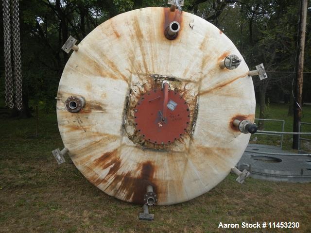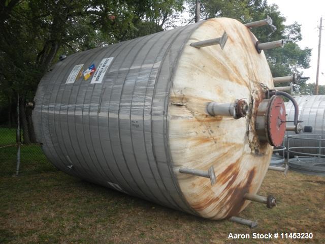 Used 12,000 Gallon Enerfab Storage Tank. 304L stainless steel construction. Approximately 12' diameter x 14'5" straight side, dome top, flat sloping bottom. Rated 2 psig at 100 f internal. Vacuum rated to 15" water column, 30" top manway, (5) 4" top nozzles, 4" side bottom outlet. API 620 rated. New 1991.