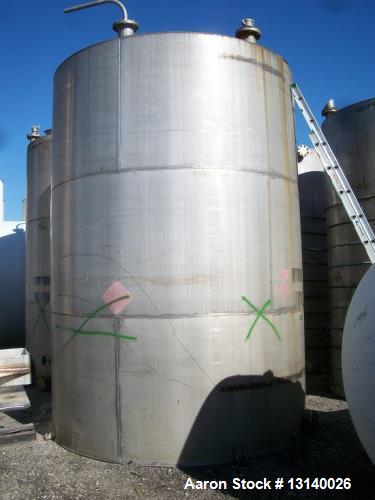 Used Joseph Oat and Sons Vertical Storage Tank. Approximately 8000 gallon, stainless steel. 10' diameter x 13'-6" high straight side. Slight cone top, flat bottom. Top Fittings: (4) 6", (1) 4" and 20" manway. (1) 4" side top inlet, (1) 4", (1) 6", and (1) 1 1/2" side bottom outlets.