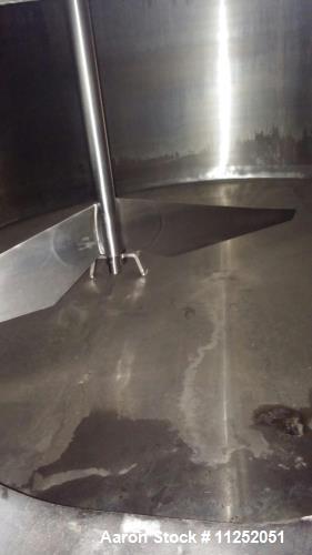 Used Walker Stainless 6,000 Gallon Stainless Steel Jacketed Tank. Measures approximately 8' internal diameter x 16' straight side, includes 86 sq. ft. jacket. Rated for 150 PSI, last running glycol. Complete with top entering agitation with 2-blade paddle at bottom of tank. Tank has a slight sloped bottom with a 2" outlet.